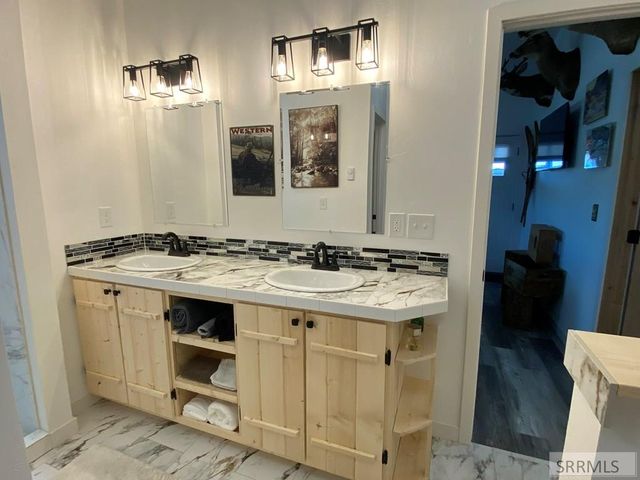 Very attractive custom built home on 0.28 of an acre in Challis. Two bedroom two bath home with open floor plan. Nice finishes and color scheme throughout the home. Spacious living room/dining room open to the kitchen area all with vaulted ceilings, open beam and wood finish. Great space to display mounts or artwork and dcor. Nice kitchen area with natural cabinetry, stone backsplash and newer appliances. Spacious master bedroom with large master bath and separate walk-in tile shower. Double sinks and walk-in closet. Guest bath and laundry combined, off of garage. Nice windows throughout, bringing lots of light. Propane fireplace in the living room with attractive tile surround. Oversize two car garage 28'x25'is finished and insulated with propane heater. Extra parking in the carport area 10'x56'. Garden area behind the home. Rockscape landscaping makes this an easy property to care for. Circular Drive and parking for trailers or RV. Very attractive property. Come take a look!